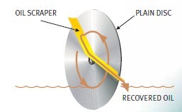轉盤盤片:盤邊緣帶擋邊的T型盤,特別適合于回收較低粘度的溢油;親油疏水的光滑圓邊圓盤,適合回收中、低粘度的溢油。